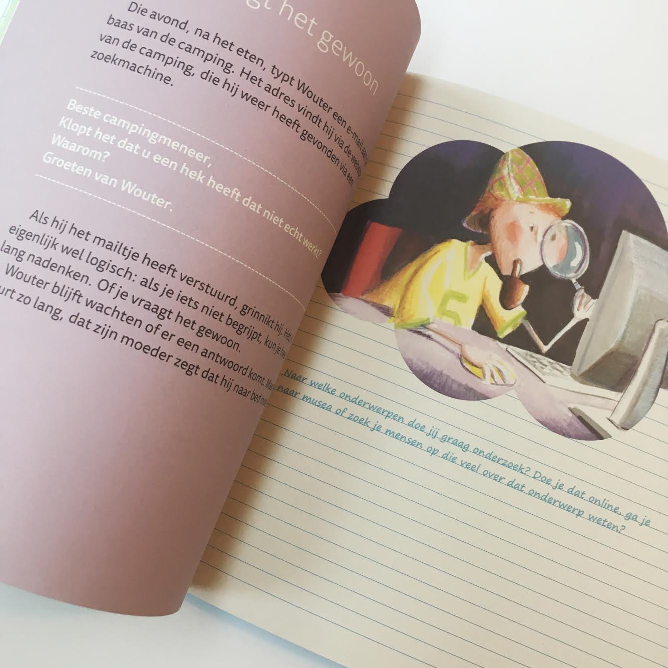 ‘Het boek ziet er aantrekkelijk uit met afwisselend gekleurde pagina’s met tekst en illustraties (..). Mijn meelezende dochter van 8 vindt deze lay-out erg mooi. Op de schriftpagina’s worden kinderen uitgenodigd om na te denken over Wouter en zijn denkwereld en om aan te geven hoe dit bij hen werkt. Er staan ook regelmatig ‘denkballonnen’ op de schriftpagina’s waarin soms ook getekend mag worden, erg uitnodigend heb ik ervaren. (…)