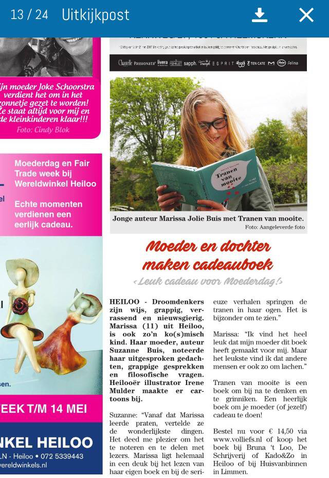 Suzanne: ‘Vanaf dat Marissa leerde praten, vertelde ze de wonderlijkste dingen. Het deed me plezier om het te noteren en te delen met lezers. Marissa ligt helemaal in een deuk bij het lezen van haar eigen boek; bij de serieuze verhalen springen de tranen in haar ogen. Het is bijzonder om te zien.’